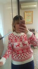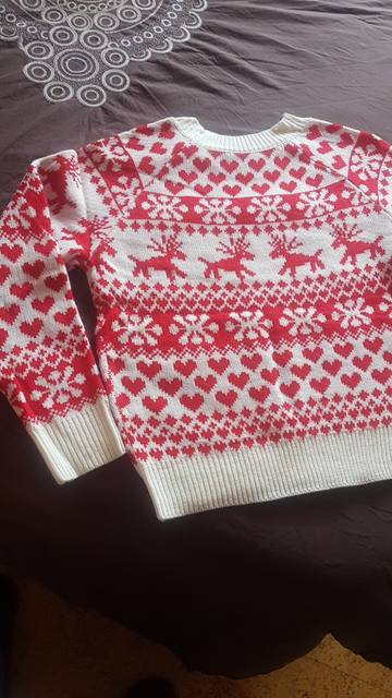 Excellent sweater, soft to the body, not pricked. Exactly as in the photo. Nice print, looks great on my wife and she loves it :-)