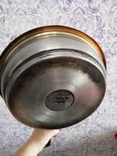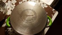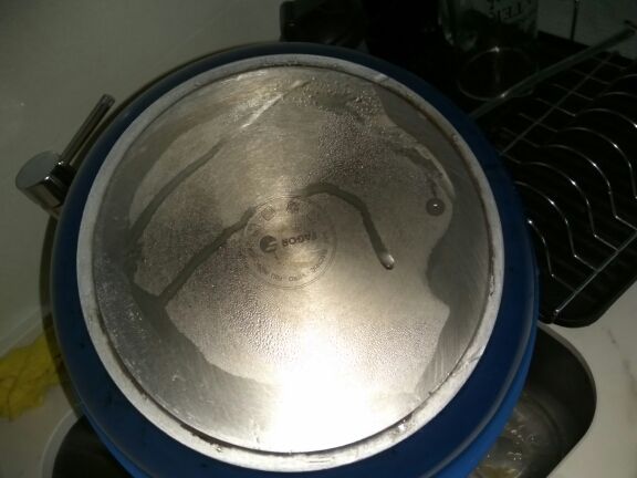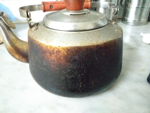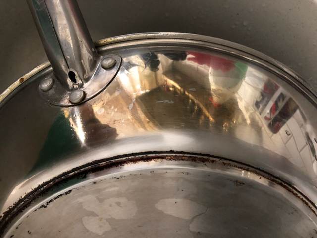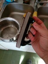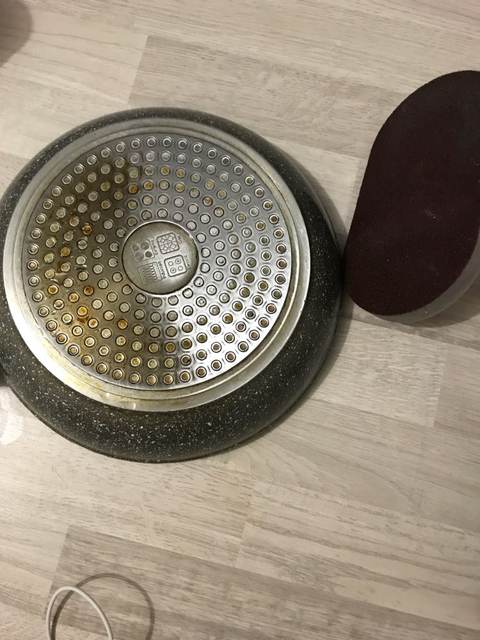 It Seemed that the fine-grained brush on the handle. Convenient. Before and after photos attached. First why "each spot" gets rusty, and then, if you rub is erased. Long waiting, and generally happy. Try another kettle scrub.