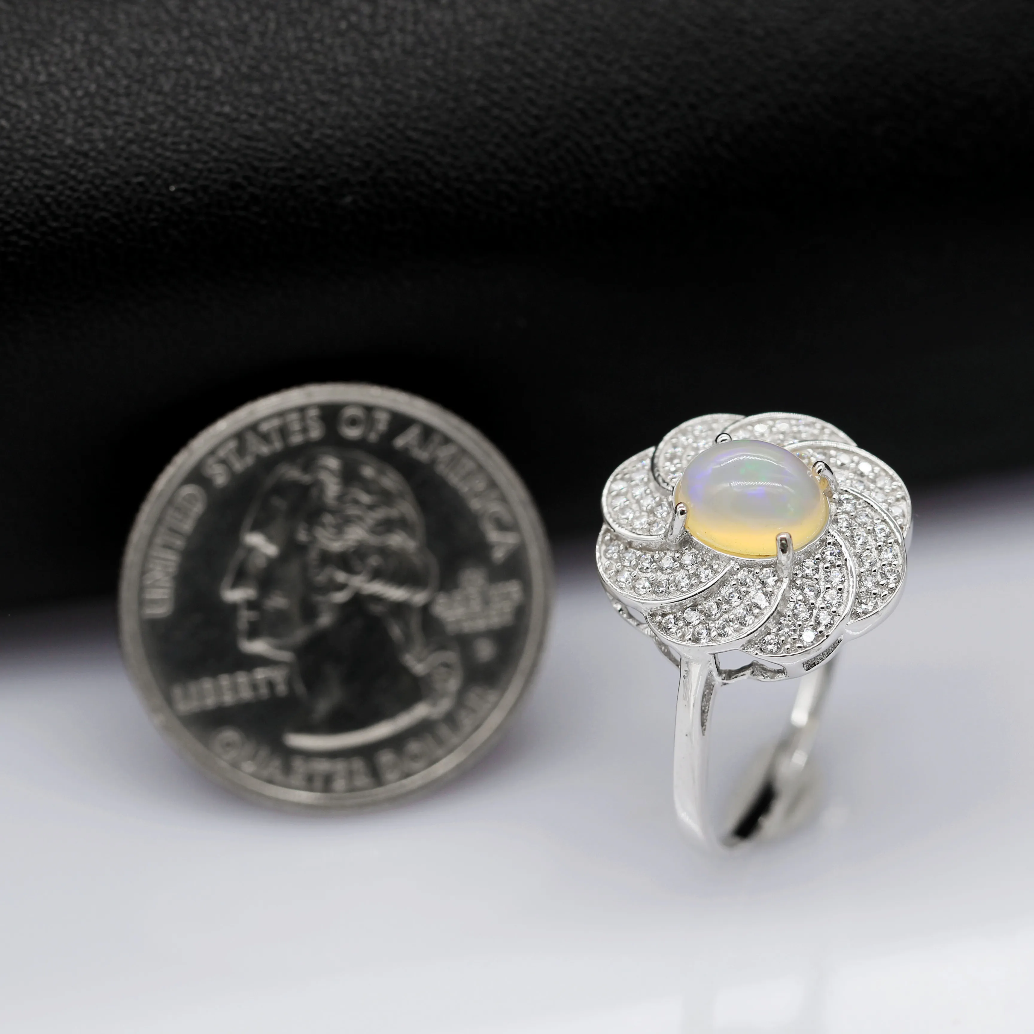 With such intricate work, it is hard to give this ring a miss. The floral petals carved out of the silver plated sterling metal stand out and the opal stone itself is majestic, both in size and appearance.